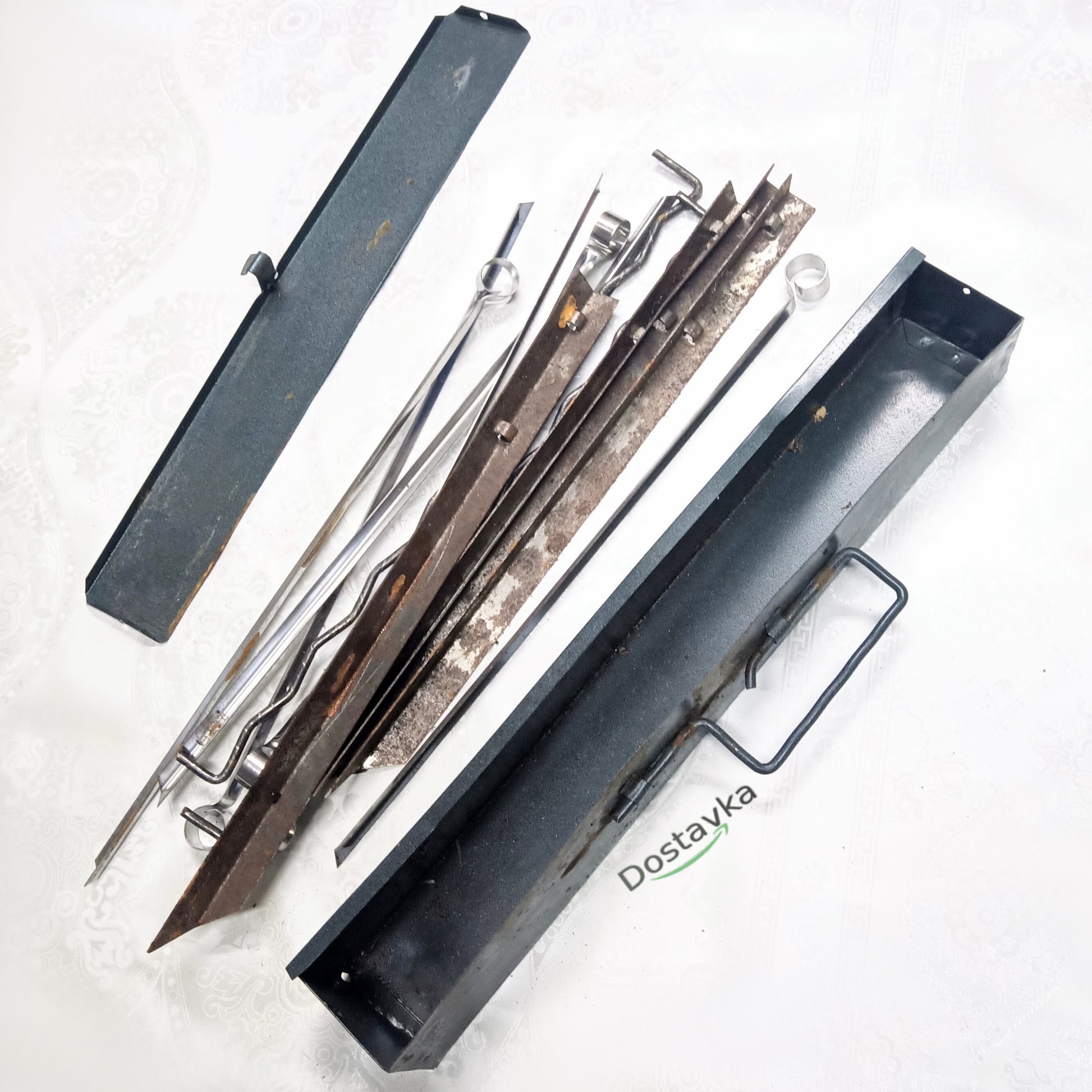 It consists of two wavy partitions that create cells for skewers and 4 legs that are stuck into the ground. The set also includes 6 skewers (40 cm) made of stainless steel and a metal box with a handle for transportation. Dimensions when packed: 43 x 6 x 6 cm.