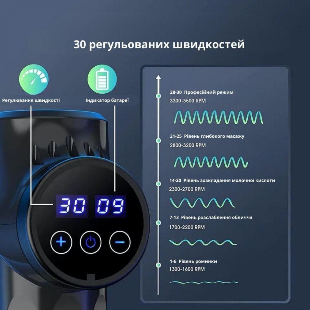 Professional Deep Massage Gun: A portable device that sends out pressure pulses that penetrate deep into muscle tissue. Relieves muscle aches, pains and soreness, accelerates muscle recovery and reduces the risk of injury during physical activity. 6 massage adapters and 30 variable speeds. Comes with four different heads to relieve muscle pain, providing targeted treatment for each muscle group. Different massage heads and speed levels provide a relaxing massage and reduce bone damage.