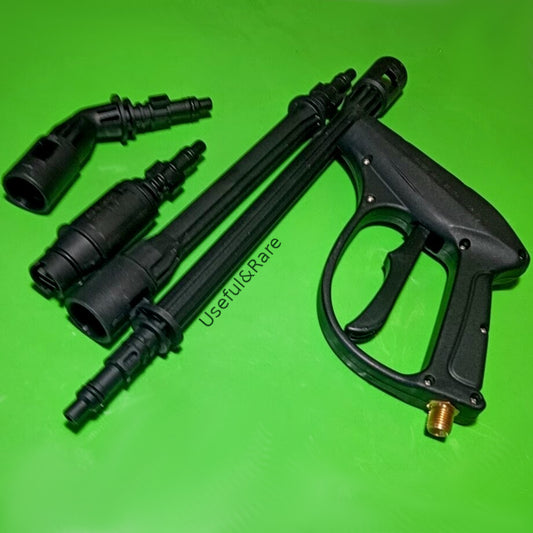 high pressure washer spray gun with hose and nozzle brass fitting 14-22 (with adapter) mm. Includes two nozzles (flat jet or cutter), two snap-on quick-release attachments and extensions can be easily removed. Suitable for water temperatures up to 50 °C. Compatible with any washer where the hose is screwed on 14 or 22 mm, for example Tekhmann PWA-2158