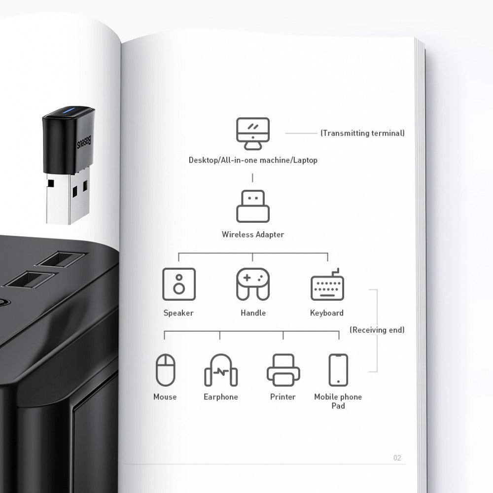 Baseus BA04 mini Bluetooth 5.0 adapter USB receiver transmitter for computer or laptop Features of Baseus BA04: Allows you to connect gadgets equipped with a Bluetooth chip to a computer or laptop up to 7 devices at the same time (mouse and keyboard, headphones and speakers, gamepads, printers, tablets, smartphones, etc.). The adapter does not require driver installation when used with Windows 8 and above, provides a stable connection without delays and failures in data transmission at a distance of up to 20 m. After the first pairing, the adapter remembers your devices and automatically establishes a wireless connection when they are back in range. The built-in indicator indicates normal operating status with a blue glow.