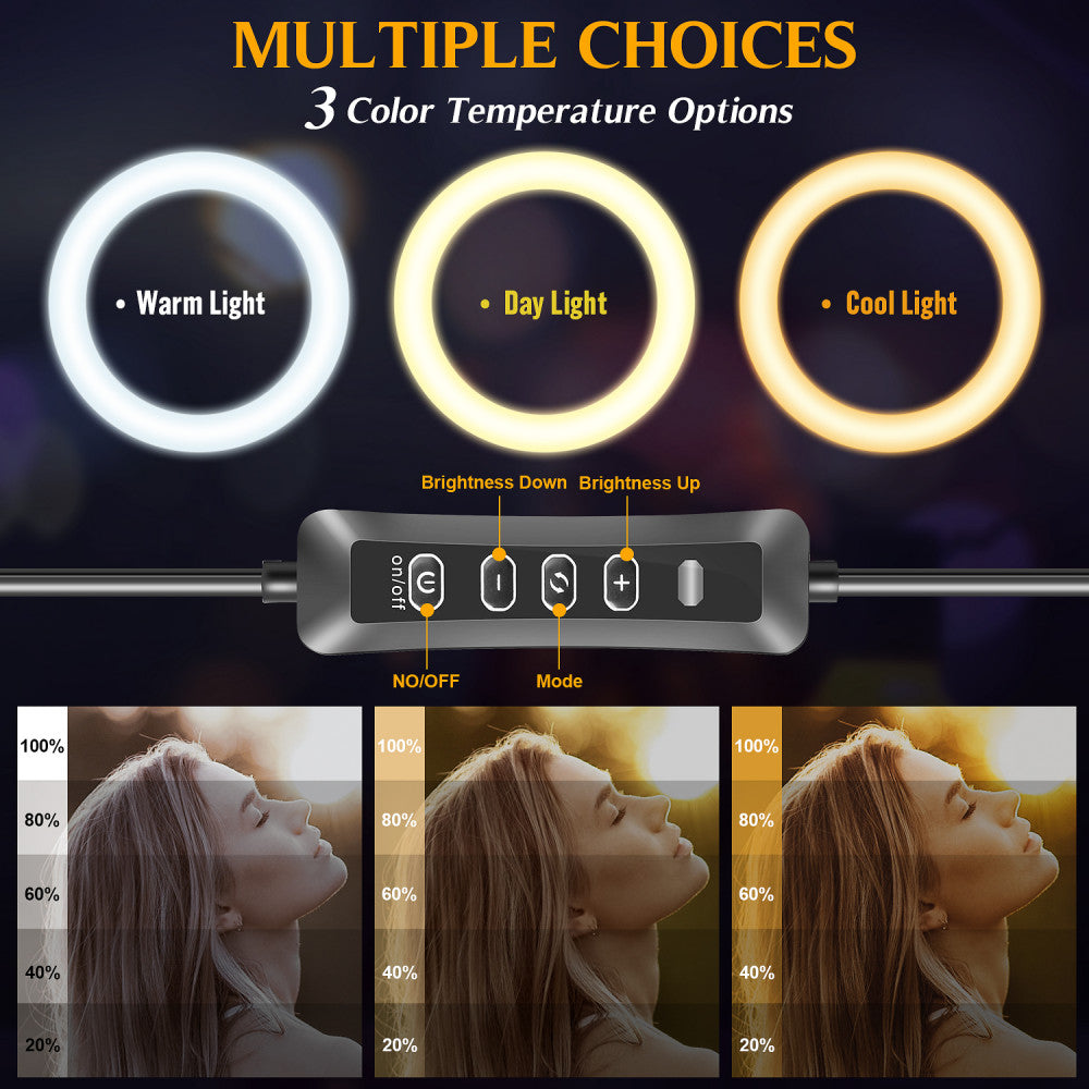 A ring lamp with a smartphone holder and a remote control is designed to set up the right light for photo sessions (for face photos - makeup, hair, etc.). Depending on the selected mode (3 backlight modes), the LEDs will illuminate your face softly and carefully, or give a studio backlight, or give lighting similar to bright spotlights. A ring lamp with a phone holder is perfect for selfies. 3 backlight modes - warm, cold, mixed (adjusted by touch control and remote control). On the back of the ring there are 4 touch buttons that are responsible for control: the power button, the light mode selection button, and two brightness adjustment buttons. This ring can also be controlled using the remote control, which is included (batteries are not included). Thanks to the remote control, you can select the light mode and brightness level from a distance, which makes adjusting the light very convenient.