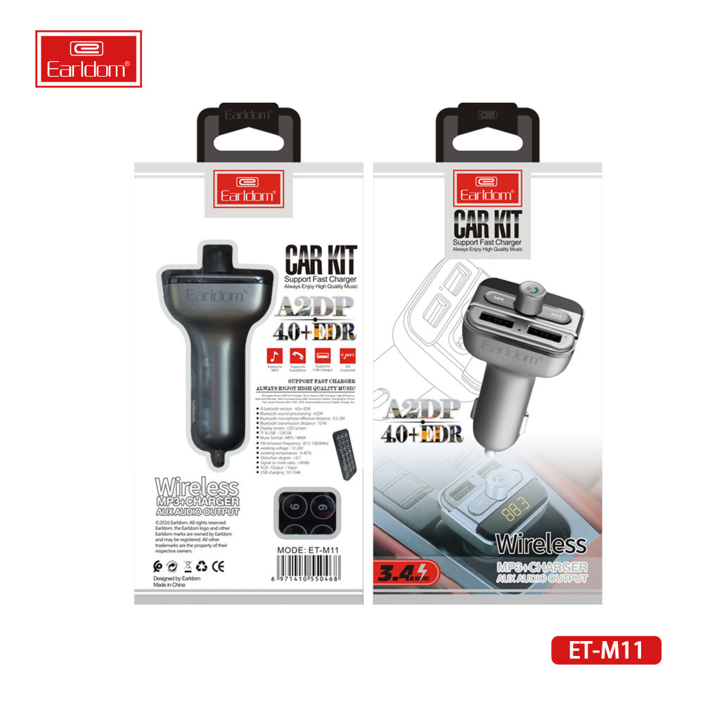 The Earldom ET-M11 modulator is a useful accessory for those who want to add the necessary functions to their car. The accessory provides wireless listening to music from different types of storage media or from a smartphone, and also has the ability to receive incoming calls. The device is made of high-quality plastic, has an ergonomic and stylish design. The model is equipped with a display showing the current FM station, a microphone, a memory card slot and a USB port.¶¶Type: car charger with FM transmitter¶Bluetooth version: 5.1¶Transmission frequency: 87.5 - 108 MHz¶Interface: Bluetooth, 2 USB, memory card up to 128 GB¶Supported formats: MP3 / WMA / WAV¶Hands-free function: yes¶LED display: yes¶Input voltage: 12-24V¶Output power: 10 Watts¶Output voltage: 5V¶Total current: 2A¶Weight 25 g