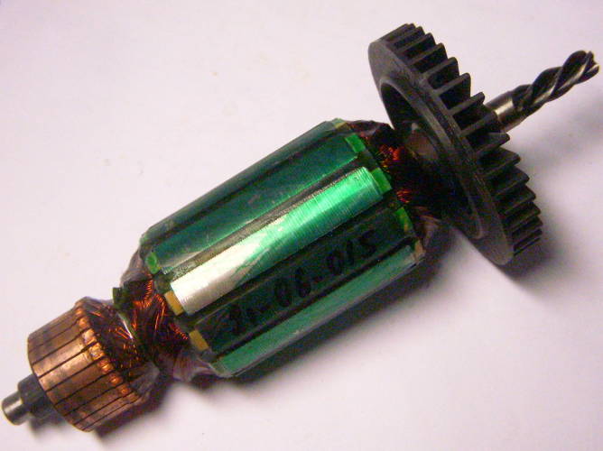 Anchor of the motor of the drill screwdriver FERM FPD-810, Einhell 750-810 W with a diameter of 38 mm, package length 47 mm, total length 154 mm, between bearings 122 mm, 4-tooth worm